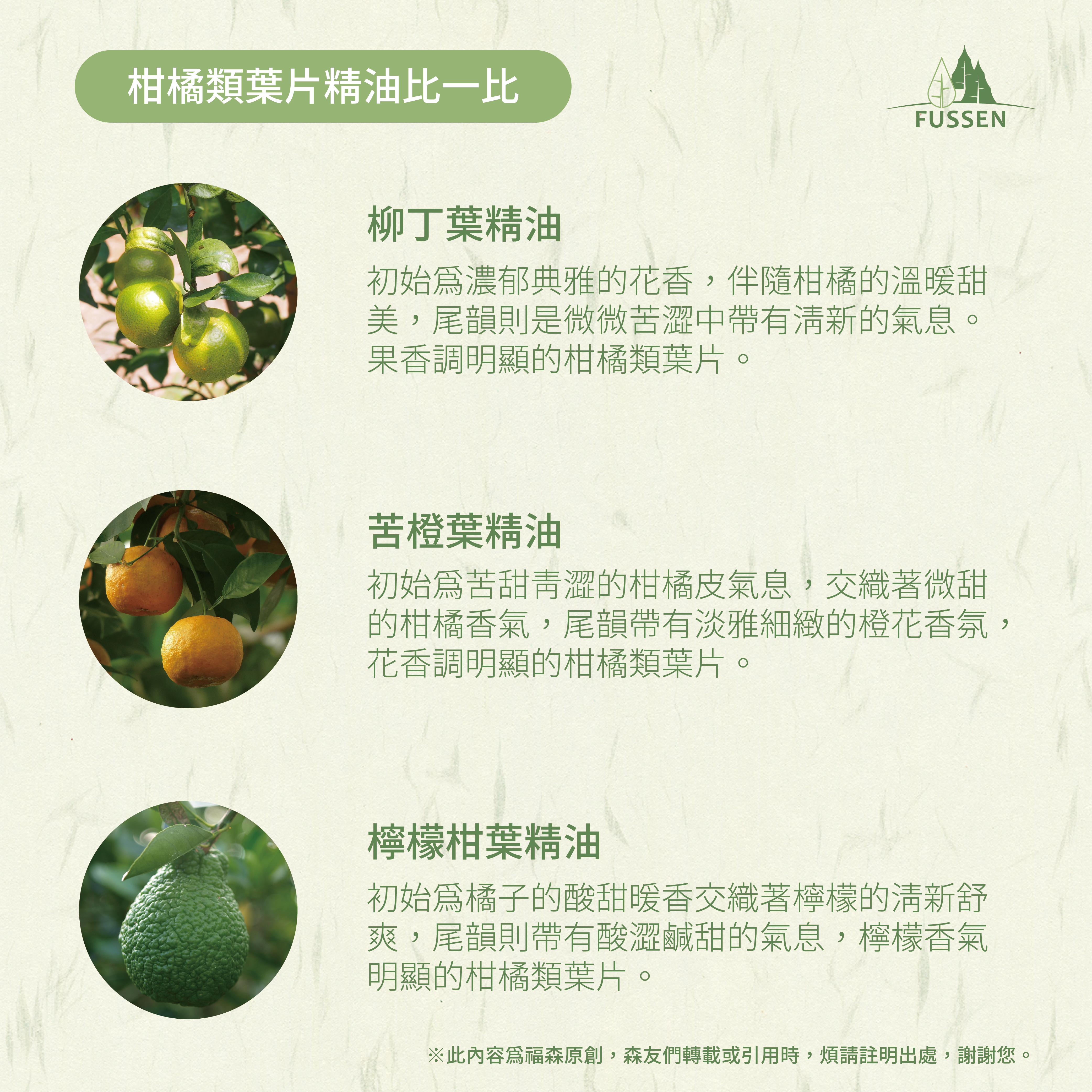 福森永續取材自台南東山的小農家所種植的柳丁樹,8-10年樹齡的果樹,經小農家的用心栽培,不僅果實香甜,葉片也略帶有酸甜的花果香氣。萃取出小批量的柳丁葉精油,並將萃取完的葉片作為堆肥再生利用,除了善用植物本體的價值,以達到循環永續的初衷,也希望讓農家們不只是採收果實、販售果物等,還能與芳香產業結合、萃取植物精油,提高農家辛勤耕耘的價值,為在地小農尋覓一線生機。