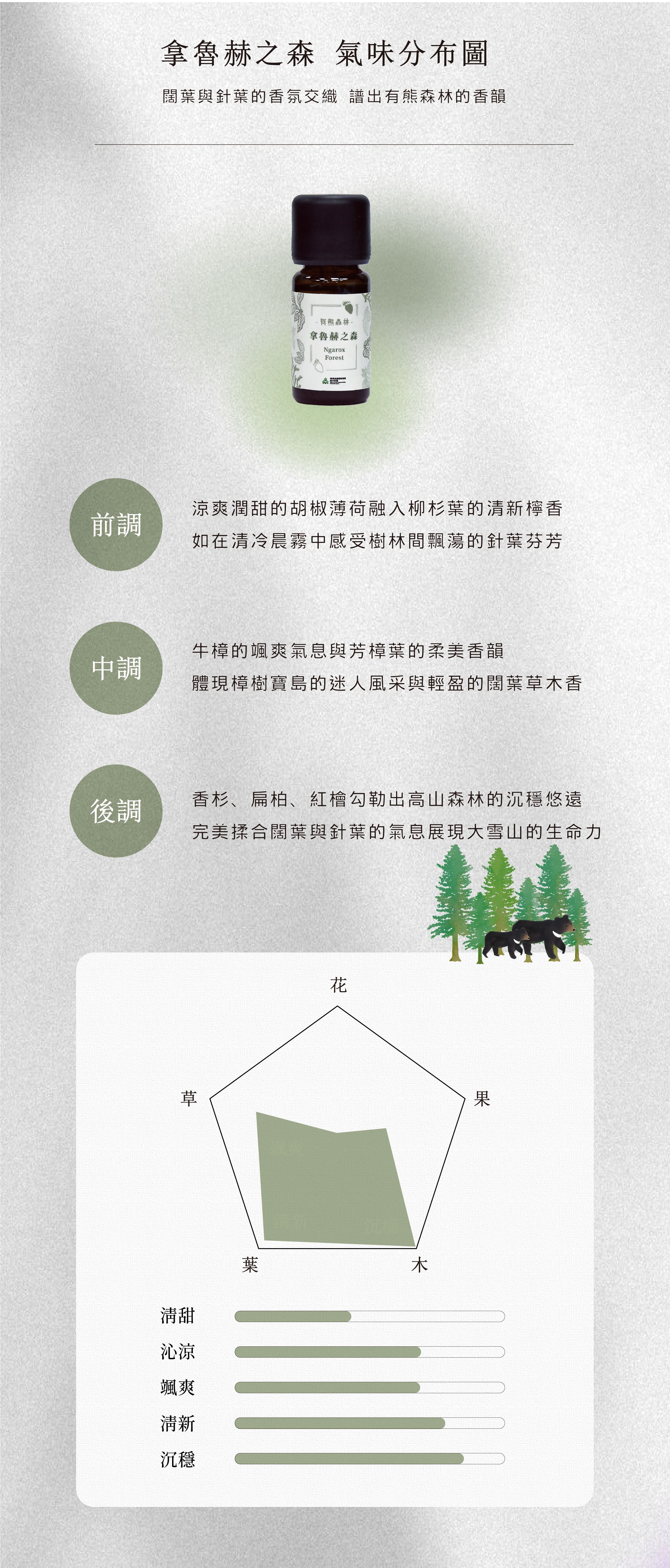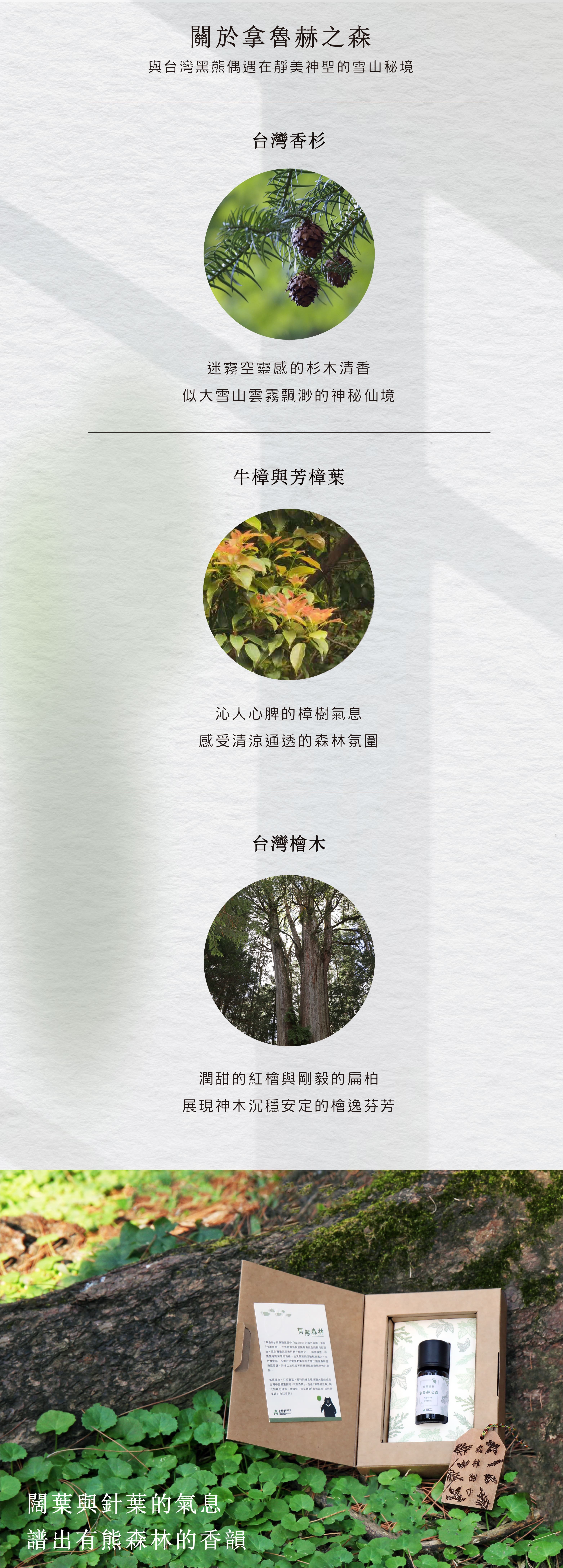 胡椒薄荷與柳杉葉散發出颯爽的芬多精氣息,佐以牛樟、芳樟葉的精油香氛,展現清新柔和的草木悠香,底韻的檜木質調沉穩靜謐、微帶甜韻,宛如處在高海拔的晨曦山林間,感受著冰冷的空氣與微暖的晨曦,與台灣黑熊偶遇在靜美神聖的檜木小徑。