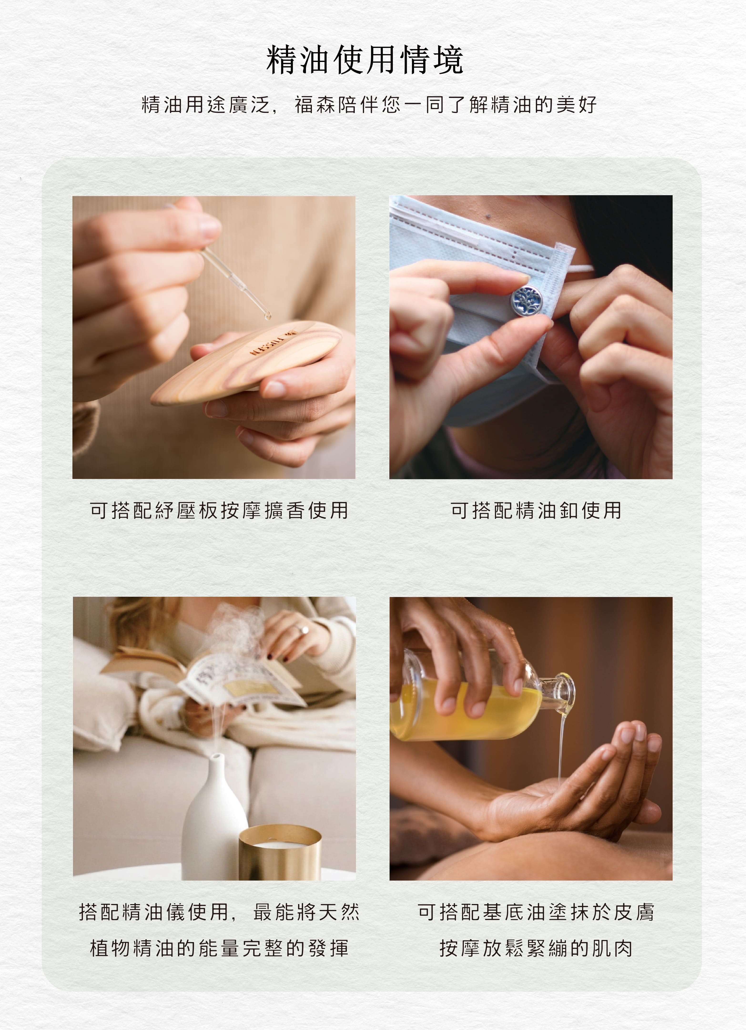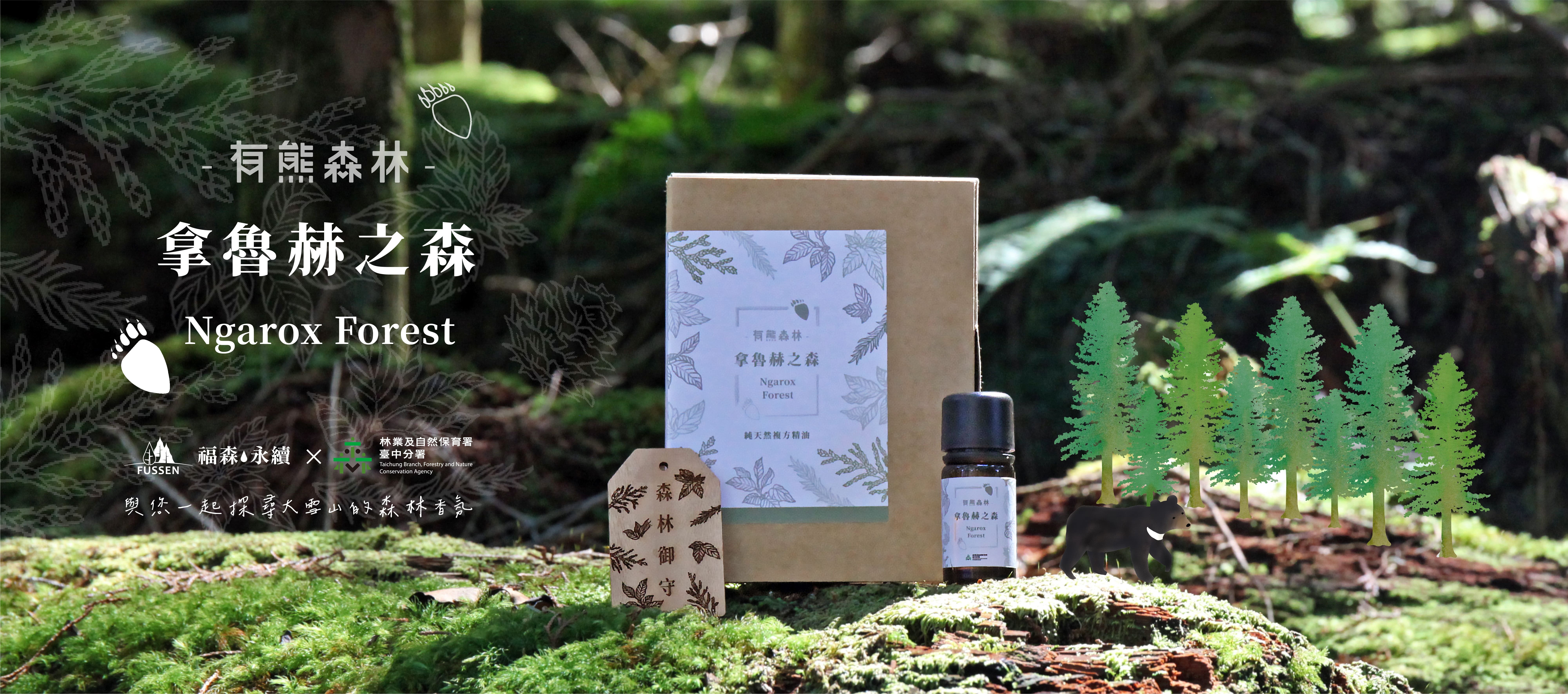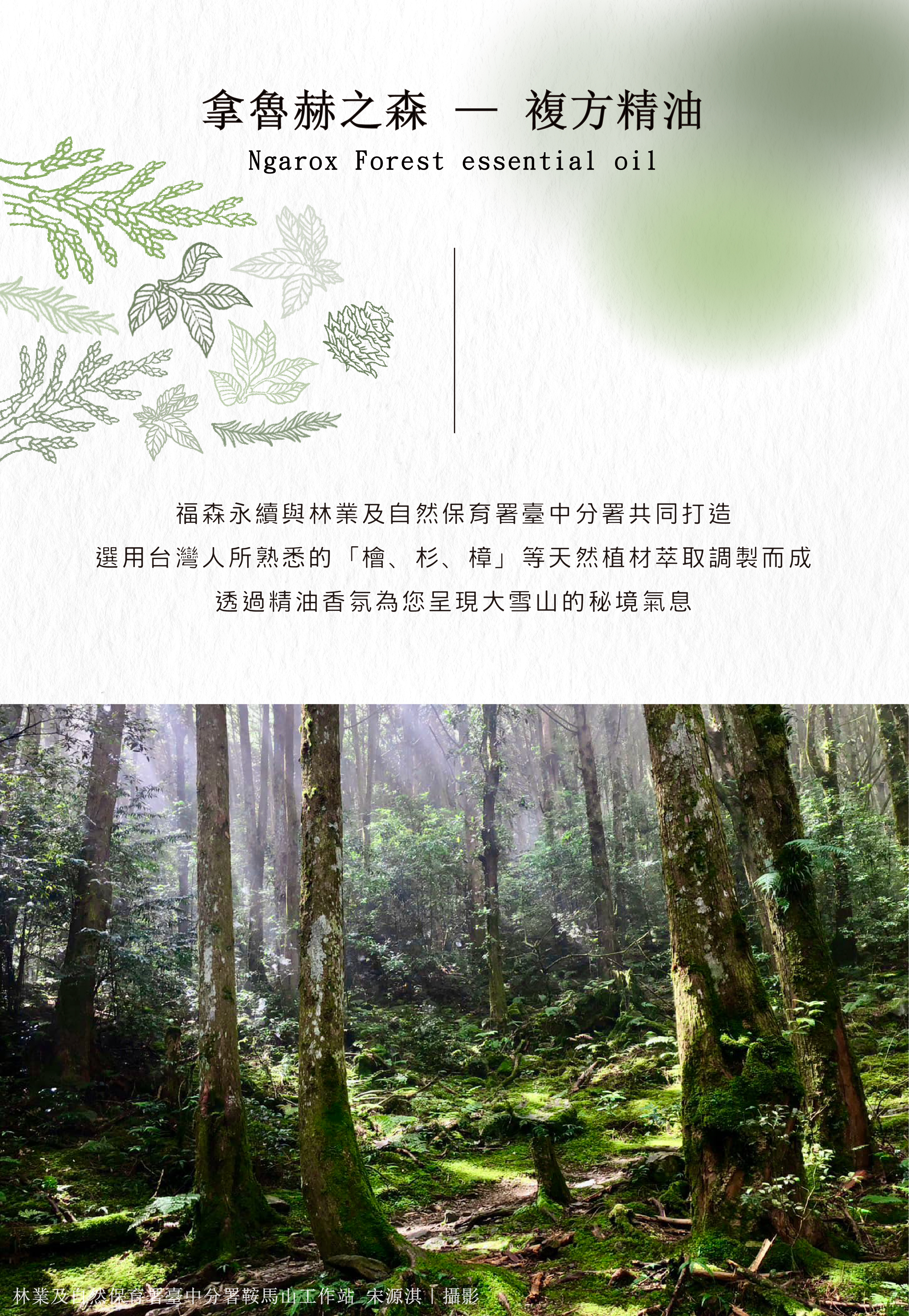 福森永續與林業及自然保育署臺中分署共同打造「拿魯赫之森複方精油」,選用台灣人所熟悉的「檜、杉、樟」等天然植材萃取、調製而成,透過拿魯赫之森複方精油香氛,為您呈現大雪山的秘境氣息。