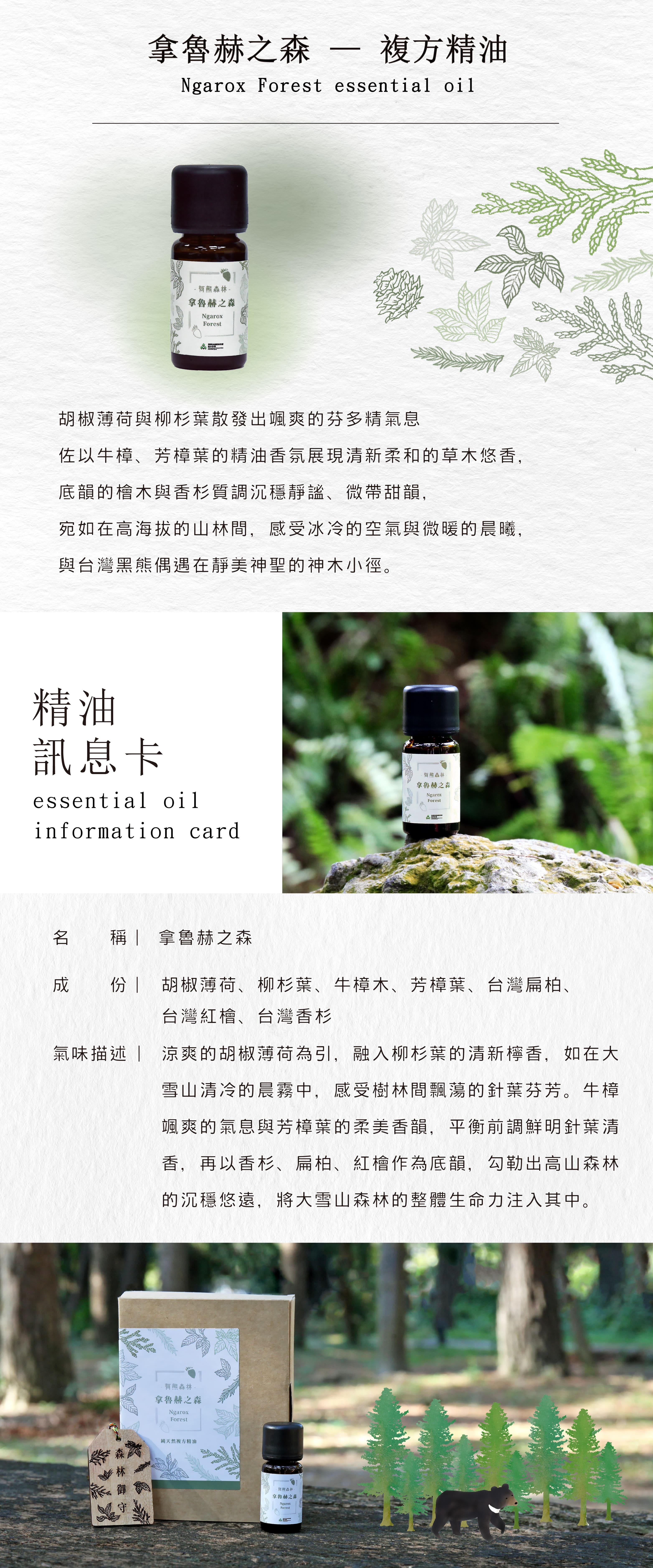 成 分:胡椒薄荷、柳杉葉、牛樟木、芳樟葉、台灣扁柏、台灣紅檜、台灣香杉。