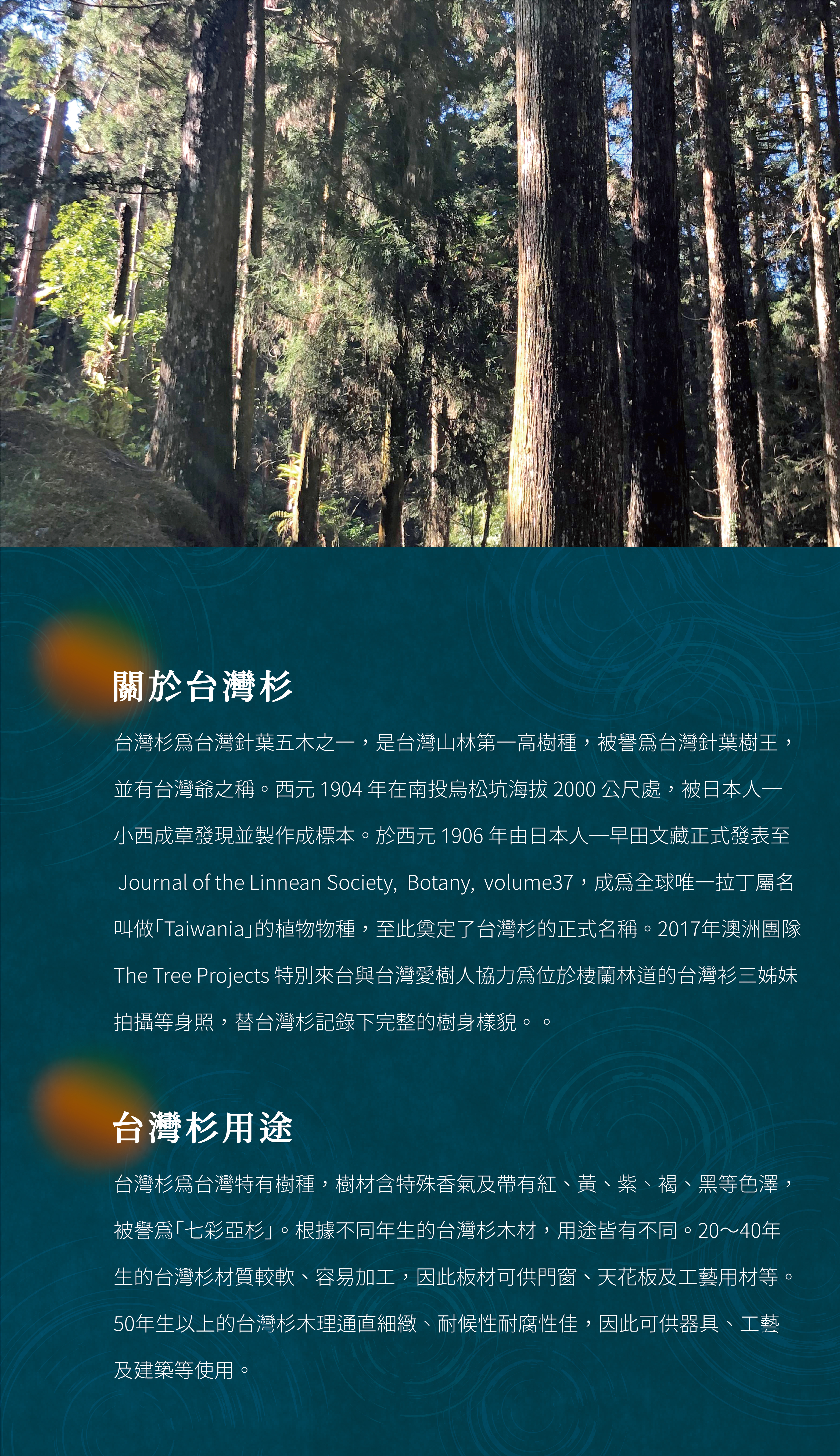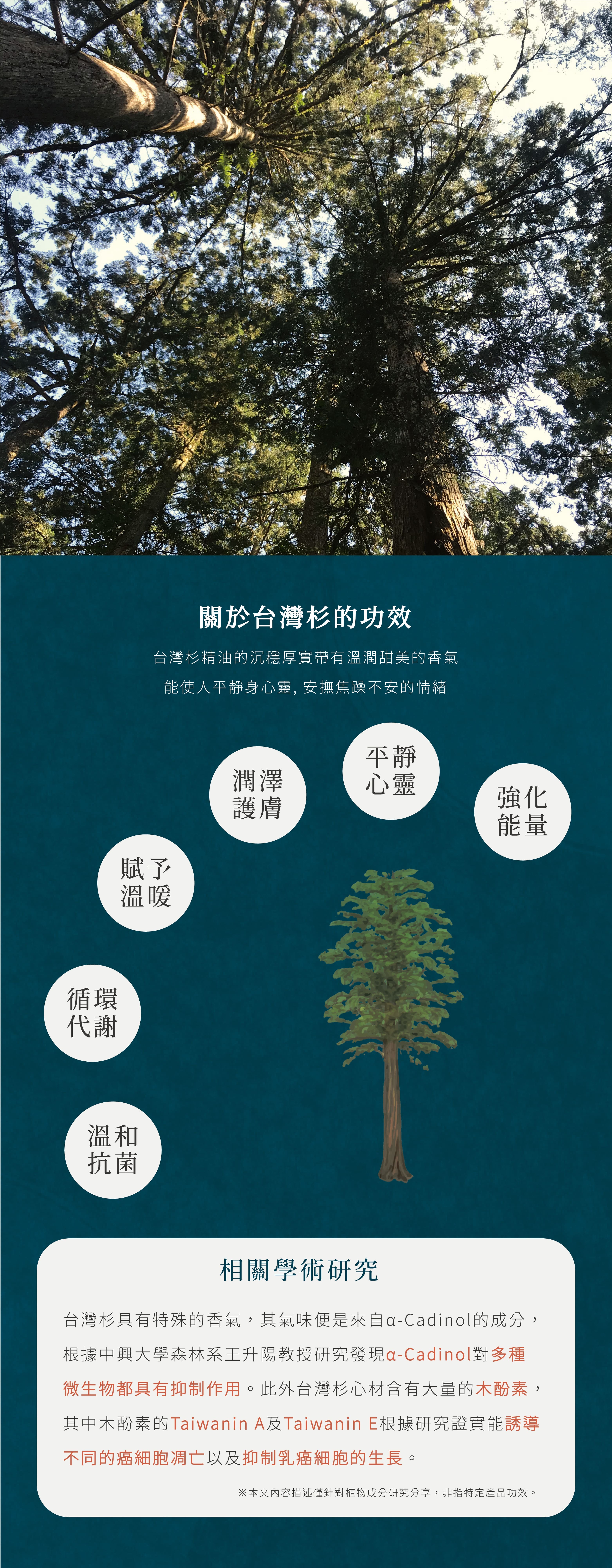 台灣杉為台灣特有樹種,是台灣針葉五木之一,被譽為台灣針葉樹王,並有台灣爺之稱。高大的樹形被魯凱族原住民封為「撞到月亮的樹」,是台灣山林第一高樹種,也是東亞第一高樹。台灣杉的氣味厚實,精油呈現溫暖的金黃色澤,暖甜濃郁的氣息中夾帶些許淡淡的清涼草香,尾韻則是帶有成熟的菸草木質調,香氣溫潤舒服。