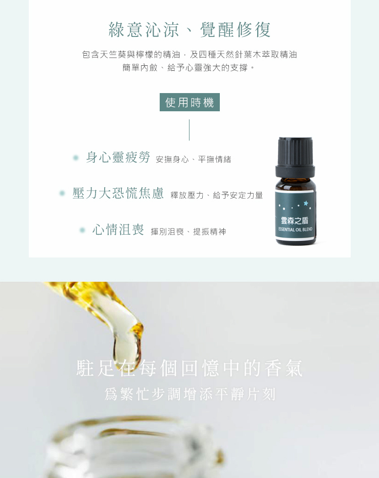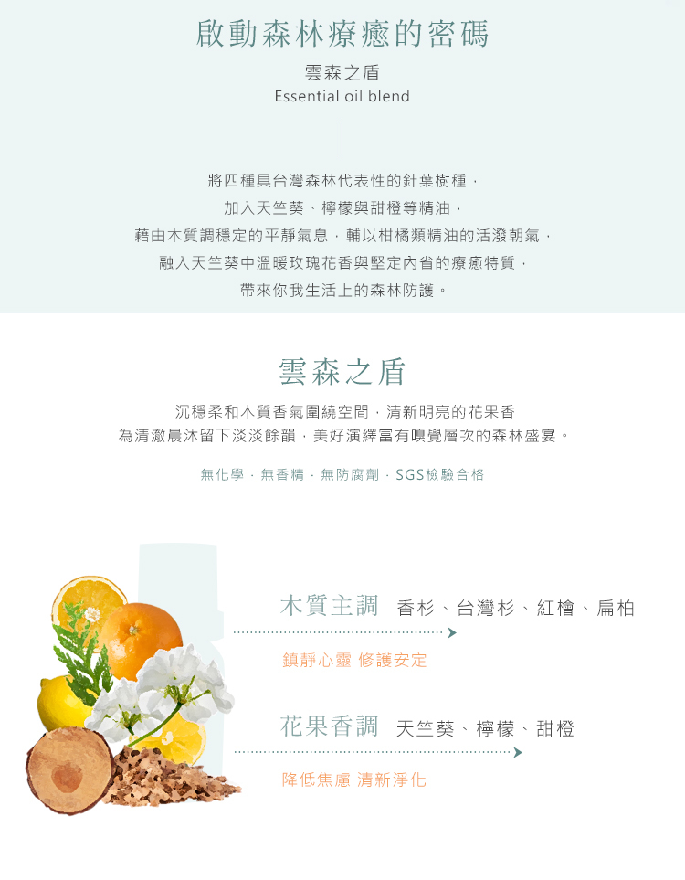 將香杉、台灣杉、紅檜、扁柏具台灣森林代表性的針葉樹種,加入天竺葵、檸檬與甜橙等精油。藉由森林木質調清新穩定的平靜氣息,輔以柑橘類精油帶來的活潑朝氣。並融入天竺葵中玫瑰花香般溫暖與堅定內省的療癒特質,帶來你我生活上的森林防護。