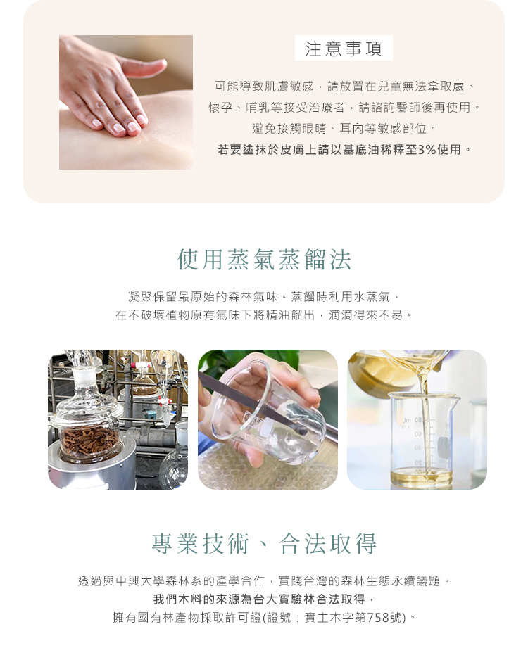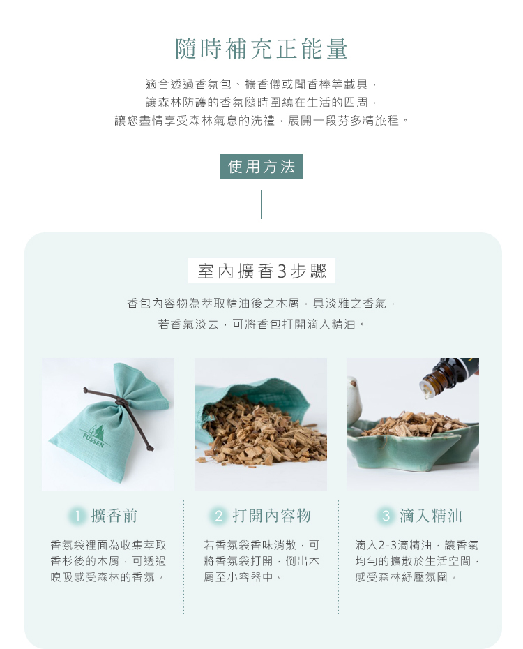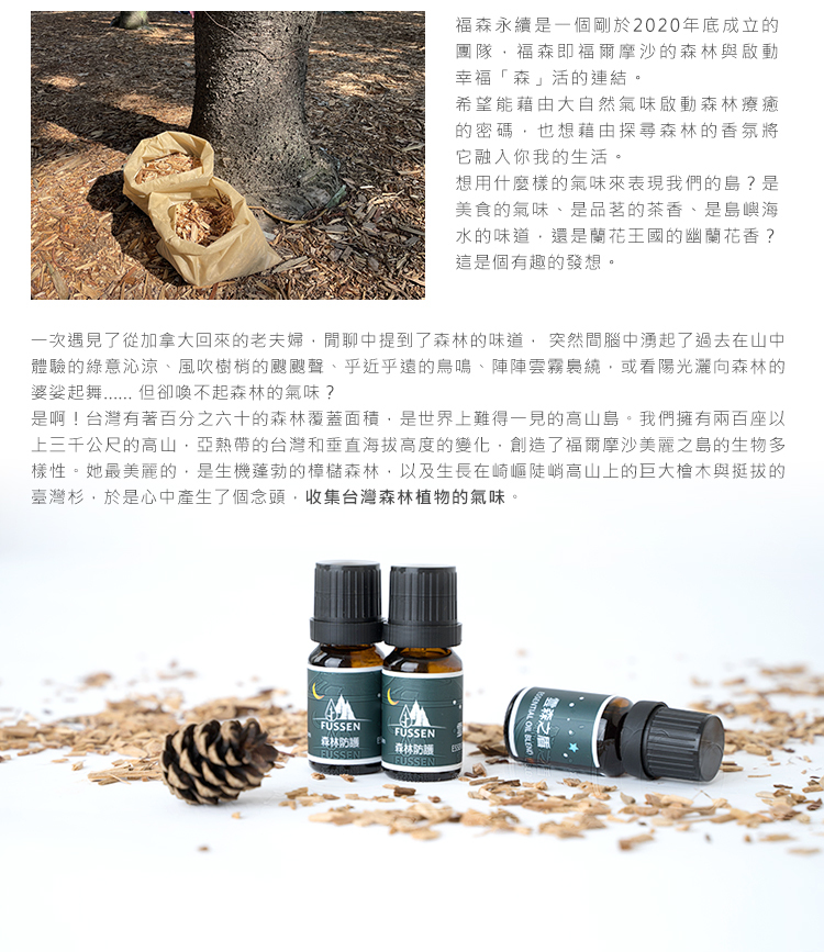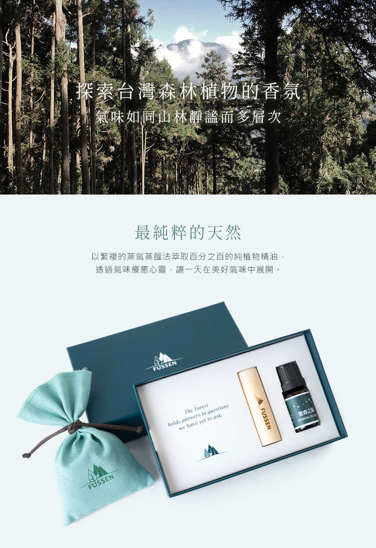 福森永續合法採集台灣一級針葉木,將台灣深山裡的珍貴林木群變成口袋森林,隨身攜帶。簡單嗅吸即充滿森林的味道,心靈上彷彿遠離煩惱塵囂;居家擴香方式更如同置身森林,身心放鬆的同時,抑菌效果也能淨化家中的每一處。